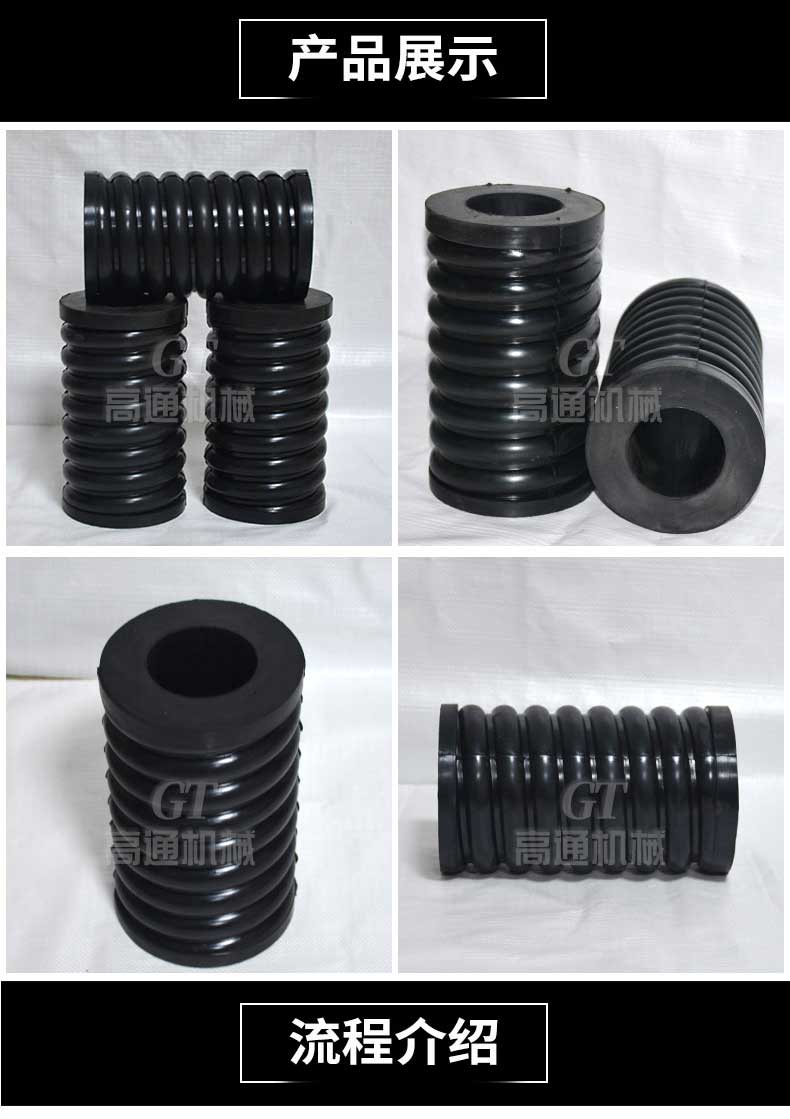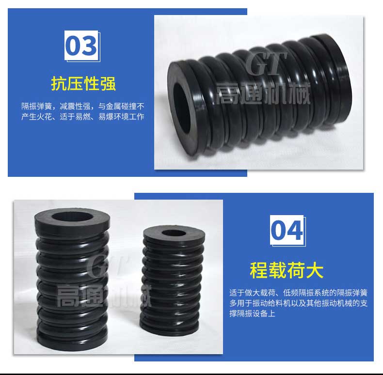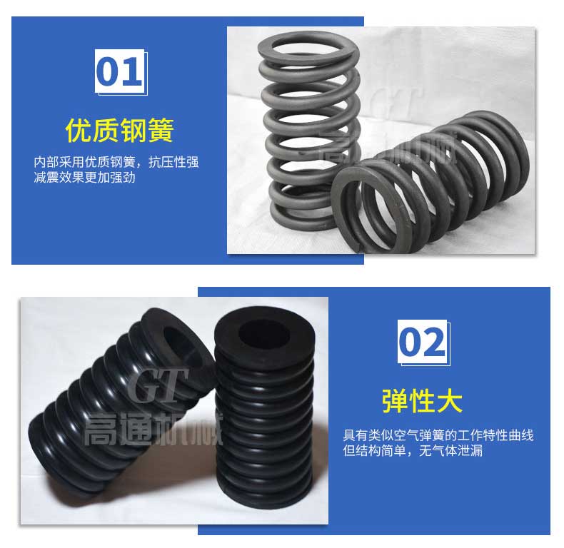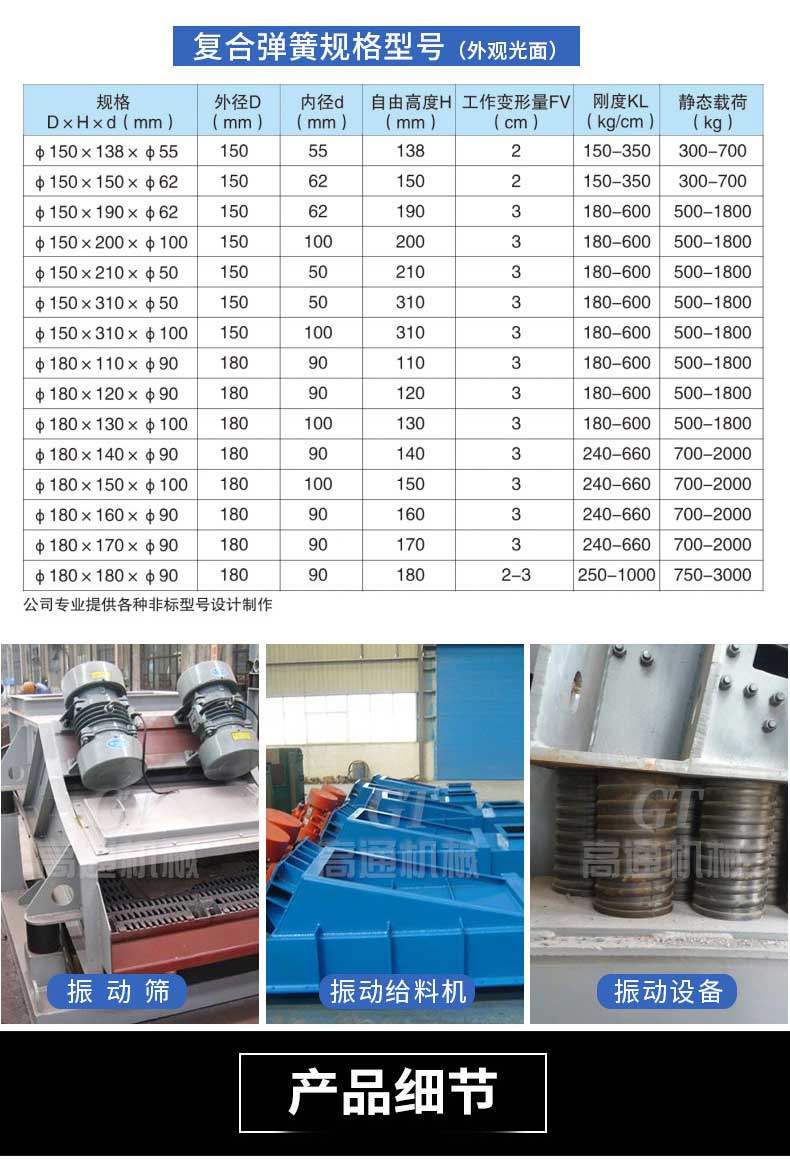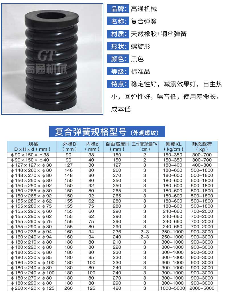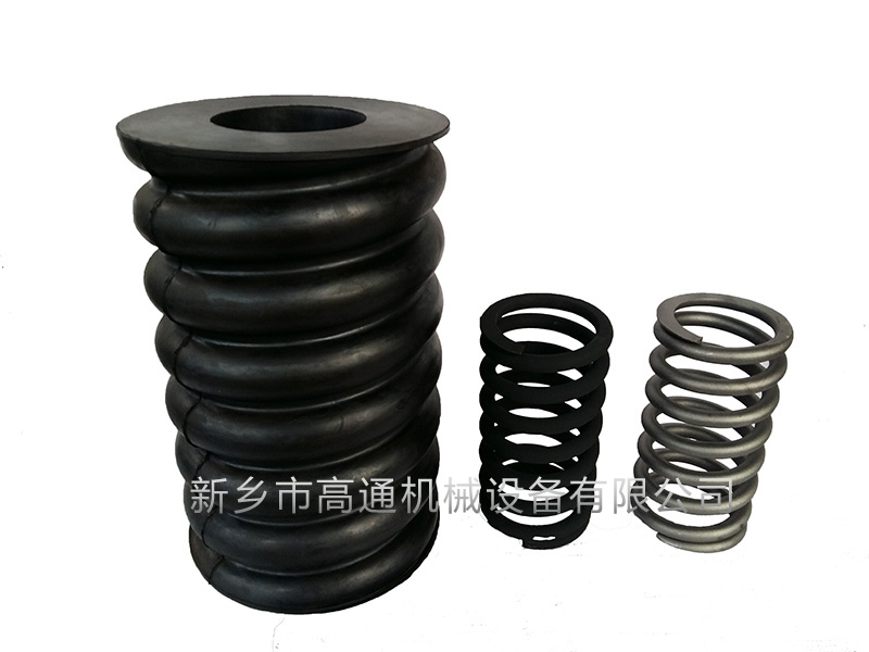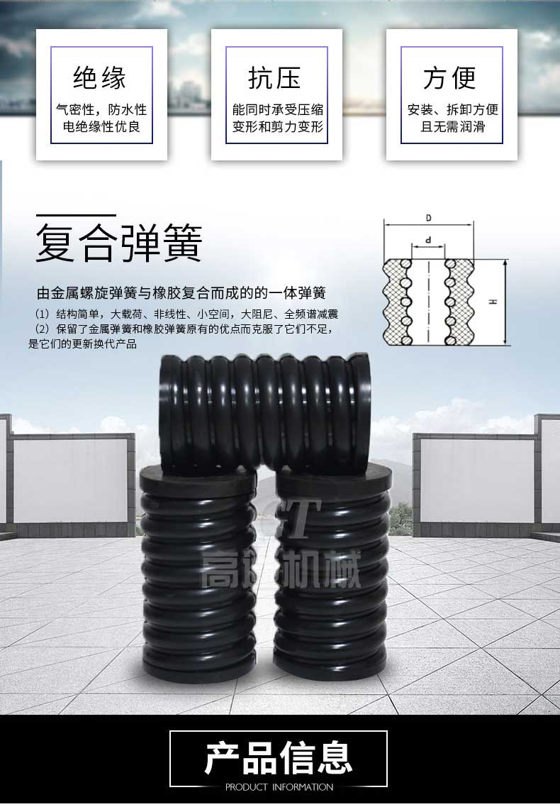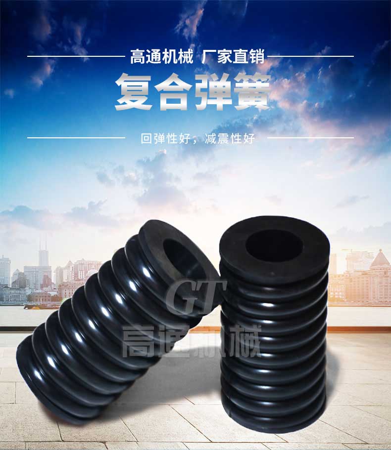復(fù)合彈簧是由金屬螺旋彈簧和橡膠復(fù)合為一體的彈性體,集金屬?gòu)椈珊拖鹉z彈簧的優(yōu)點(diǎn)于一體,并克服兩者的缺點(diǎn)。形狀和機(jī)械性能穩(wěn)定,能承受載荷和大變形量。隔振降噪效果好,具有工作平穩(wěn),共振區(qū)時(shí)間短等優(yōu)點(diǎn),尤其適用于礦山、冶金、煤炭等行業(yè)的大型振動(dòng)設(shè)備或大型減震設(shè)備。