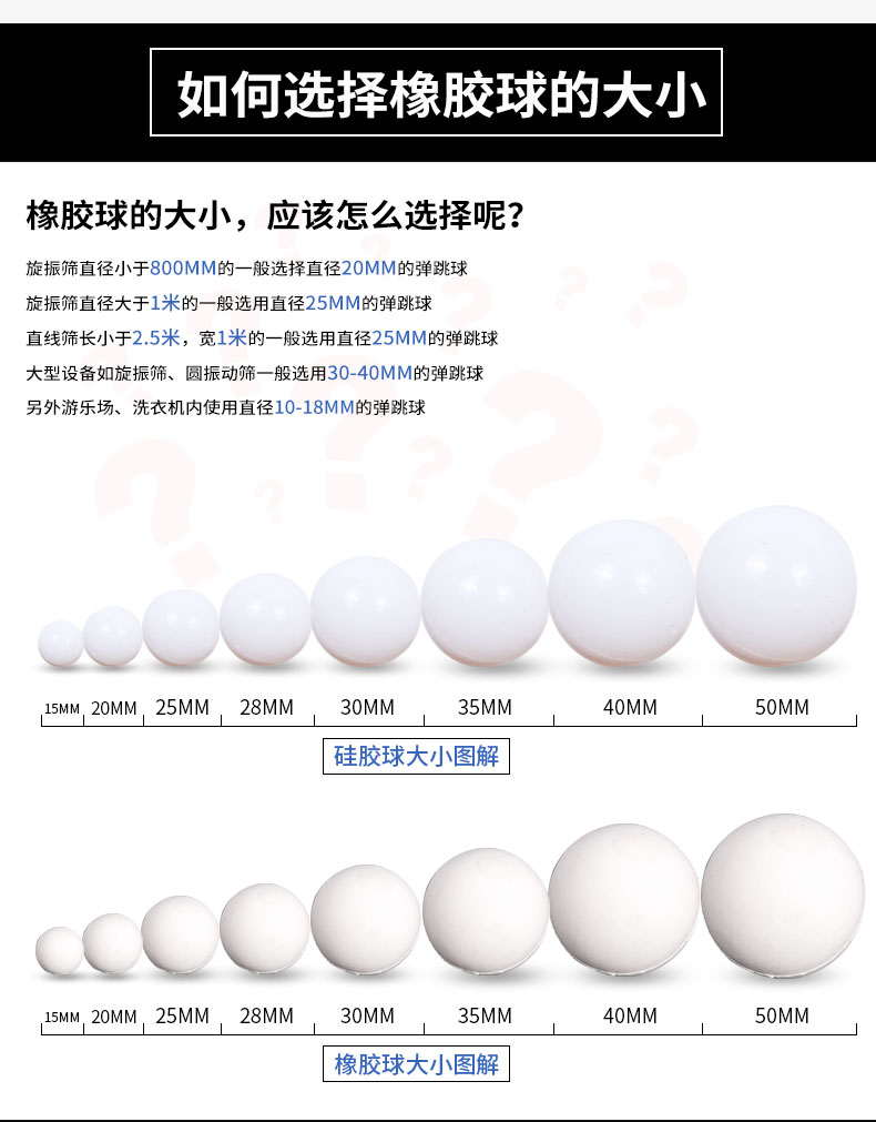 常見(jiàn)振動(dòng)篩彈跳球的尺寸通常有Φ10、Φ15、Φ20、Φ25、Φ28、Φ30、Φ40等
